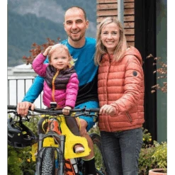 Da sich der Schwerpunkt weiterhin zwischen den zwei Rädern befindet, merkt man kaum einen Unterschied bezüglich des Fahrverhaltens. Der Sitz ist mit 900 Gramm ein Leichtgewicht und lässt sich auf jedem Fahrrad mit Oberrohr montieren. Selbst breite Rahmen (z.B. Ebike) sind kein Problem. Die Befestigung ist einfach und der Sitz kann innerhalb weniger Minuten montiert oder demontiert werden, ohne dass dafür Werkzeug benötigt wird. Der Rahnen wird geschont. Das Kind wird an der Hüfte und an den Füssen mit Sicherheitsgurten gesichert.