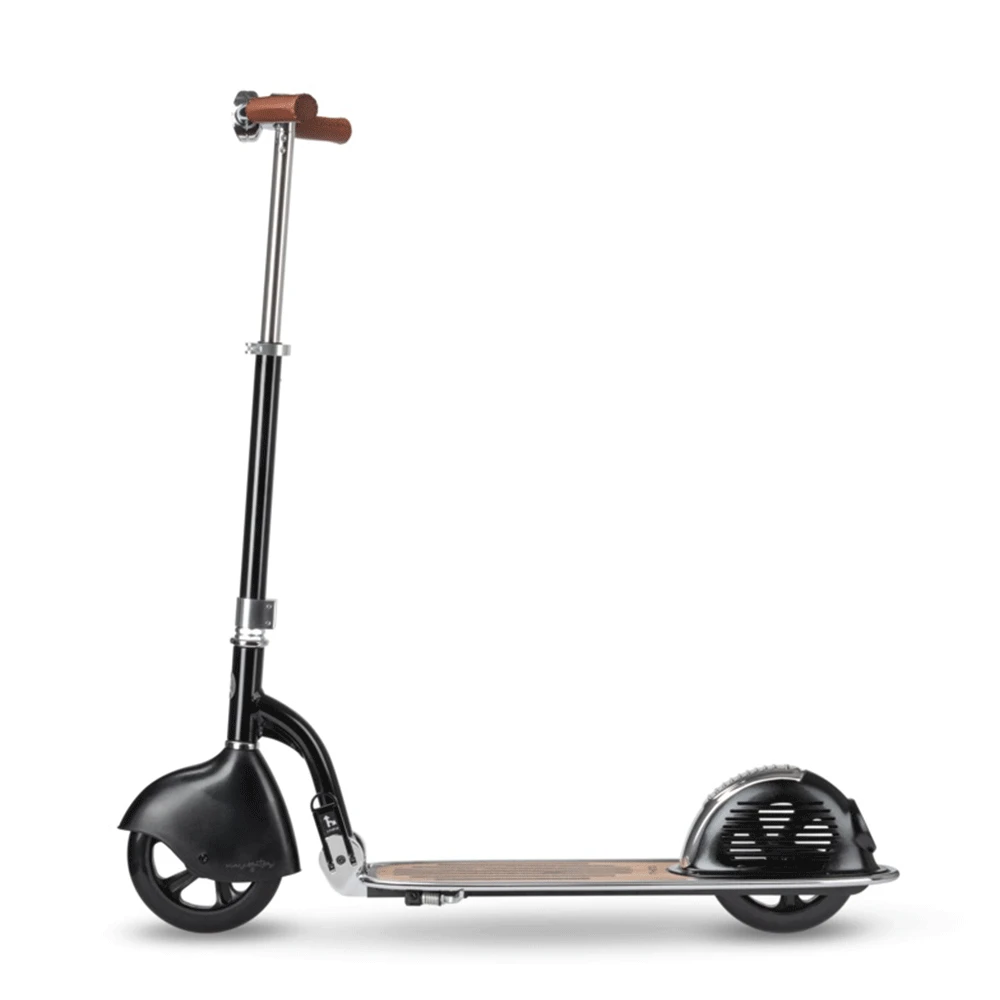 Entdecke den einzigartigen, ergonomischen Aluminium-Scooter mit hochwertigen Kunstledergriffen, integriertem Kompass und breitem Deck im Holzdesign.